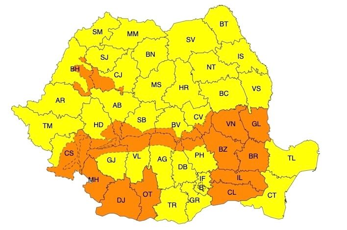 COD PORTOCALIU: 10 aprilie, ora 12 – 10 aprilie, ora 23, intensificări puternice ale vântului în zona joasă a județelor Mehedinți, Dolj și Olt, viscol puternic și vizibilitate sub 50 m înCarpații Meridionali, Carpații de Curbură, Munții Banatului și local în Munții Apuseni