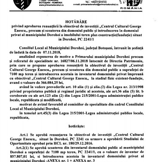 „aprobarea renunțării la obiectivul de investiții Centrul Cultural George Enescu, precum și scoaterea din domeniul public și introducerea în domeniul privat al municipiului Dorohoi a imobilului teren plus construcție (fundație) situat în Dorohoi/PC 2241/1”