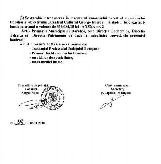 Pe data de 7 noiembrie, la ora 15.00, a fost convocată o ședință de îndată a Consiliului Local Dorohoi, cu patru puncte pe ordinea de zi. Două dintre aceste proiecte aveau legătură între ele și vizau cedarea terenului și a construcției începute la Centrul Cultural George Enescu.Înainte de 1990 s-a început în zona zero a municipiului Dorohoi, construcția Centrului Cultural George Enescu pe o suprafață de 7100 de metri pătrați. Lucrările s-au oprit prin 1992. Au fost câteva tentative de a ceda terenul și fundația construită unei companii care urma să realizeze un centru comercial dar nu s-a reușit. Fără a face prea mult tam-tam, executivul primăriei a decis între timp să cedeze construcția și 5000 din cei 7100 de metri pătrați, unui agent economic care vrea să construiască un hotel.Pentru a putea fi cedat terenul și construcția începută, era nevoie de o hotărâre de Consiliu Local privind renunțarea la centrul cultural, scoaterea lui din domeniul public și trecerea în domeniul privat. S-a convocat o ședință de Consiliu Local de îndată în care a fost supus la vot proiectul de hotărâre privind