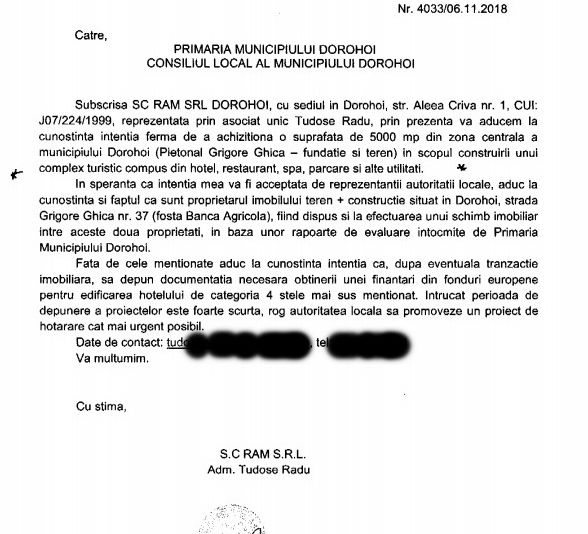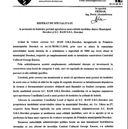În data de 6 noiembrie 2018, SC RAM SRL, firmă administrată de Radu Tudose, a depus o cerere la Primăria Dorohoi prin care își arată intenția fermă de a achiziționa suprafața de 5000 mp, în zona centrală a municipiului Dorohoi (Pietonal Grigore Ghica – fundație și teren) în scopul construirii unui complex turistic, compus din hotel, restaurant, spa, parcare și alte utilități. Reprezentanții primăriei au convocat imediat o ședință de Consiliu Local pentru data de 7 noiembrie 2018 și au supus spre aprobare efectuarea unui schimb imobiliar între Municipiul Dorohoi și SC RAM SRL.Mai exact, SC RAM SRL predă municipiului Dorohoi un imobil aflat pe strada Grigore Ghica nr 37, evaluat la 1.487.000 lei, iar Radu Tudose, administratorul SC RAM SRL, primește de la municipiul Dorohoi imobilul format din suprafața de 5000 mp teren pe care se află fundația Centrului Cultural George Enescu, cu o valoare de 2.298.293 lei. Diferența de preț stabilită prin rapoartele de evaluare, de 811.293 lei precum și cheltuielile notariale, urmând a fi suportate de Radu Tudose.În raportul de specialitate se precizează:
