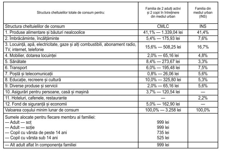 Pe de altă parte, potrivit statului român, o familie de doi adulți și doi copii ar avea nevoie de aproape trei ori mai puțini bani pentu un trai decent. Datele apar în Decizia privind aprobarea Criteriilor generale pentru stabilirea nivelului de trai rezonabil, stabilite de Comisia de Insolvență la Nivel Central, o familie de doi adulți și doi copii ce trăiește la oraș ar avea nevoie de o sumă de 3.258 lei pe lună. În această sumă ar intra cheltuielile cu mâncarea - 1.339 lei, cu hainele - 175,93 lei, dar și economii de 162,9 lei.