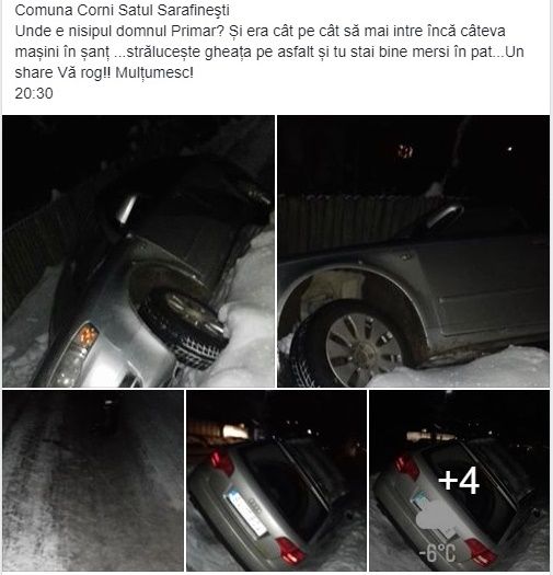 Un botoșănean a postat în această seară un mesaj pe facebook și câteva fotografii cu o mașină ajunsă într-un șanț și cu drumul acoperit de gheață și zăpadă. În jurul orei 20.30, acesta se deplasa cu mașina prin localitatea Sarafinești, pe un drum acoperit cu gheață și zăpadă. Nu a mai putut controla autoturismul și a ajuns cu el în șanț.„Comuna Corni Satul Sarafineşti. Unde e nisipul domnul Primar? Și era cât pe cât să mai intre încă câteva mașini în șanț ...strălucește gheața pe asfalt și tu stai bine mersi în pat..”, a scris botoșăneanul pe