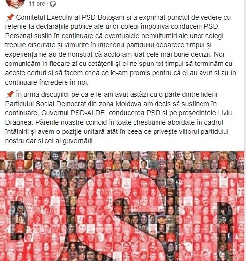 „Comitetul Executiv al PSD Botoșani si-a exprimat punctul de vedere cu referire la declarațiile publice ale unor colegi împotriva conducerii PSD. Personal susțin în continuare că eventualele nemulțumiri ale unor colegi trebuie discutate și lămurite în interiorul partidului deoarece timpul și experiența ne-au demonstrat că acolo am luat cele mai bune decizii. Noi comunicăm în fiecare zi cu cetățenii și ei ne spun tot timpul să terminăm cu aceste certuri și să facem ceea ce le-am promis pentru că ei au avut și au în continuare încredere în noi.