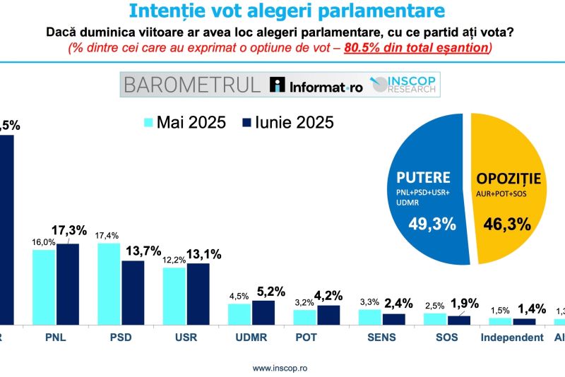 Conform BAROMETRULUI Informat.ro – INSCOP Research, realizat în perioada 20-26 iunie 2025, AUR conduce detașat în preferințele electoratului pentru alegerile parlamentare.