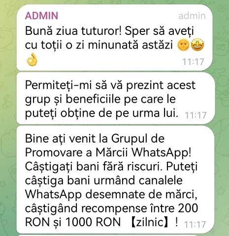 Totul debutează cu un mesaj aparent prietenos: „Bună ziua tuturor! Sper că aveți cu toții o zi minunată astăzi! Permiteți-mi să vă prezint acest grup și beneficiile pe care le puteți obține de pe urma lui”. Așa ești introdus într-un grup necunoscut, unde ți se oferă sarcini simple, precum urmărirea unor canale de WhatsApp, în schimbul unor sume cuprinse între 200 și 1.000 de lei pe zi. Prima plată, însă, este mai modestă — doar 20 de lei.