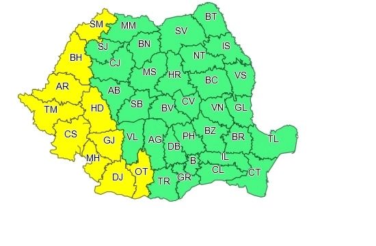 Administrația Națională de Meteorologie a emis o atenționare meteo cod galben de ploi violente și vânt puternic, valabilă pentru mai multe zone din țară. În paralel, a fost emis un cod galben de caniculă, valabil în partea de NV a țării.