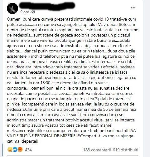 „Oameni buni care cumva prezentați simptomele covid 19 tratați-vă cum puteți acasă....să nu cumva să ajungeți la Spitalul Mavromati Botoșani o mizerie de spital că într-o săptămână vă este luată viața cu o cruzime de nedescris....sunt scene de groază acolo. Vă povestesc un pic cazul mamei mele care vinerea trecută ajunge în stare bună la ei.....odată ajunsă acolo nu știu ce i s-a administrat că deja a doua zi era foarte slăbită......dar cel puțin comunicam cu ea prin telefon....după două zile asistentele îi închid telefonul pt a nu mai putea lua legătura cu noi să ne povestească realitatea din acest infern.....este sedată deși dacă era întra-adevăr sub tratament se vedeau efectele... Sedarea nu era încă necesară o sedează zic ei ca să o liniștească să își facă efectul tratamentul neadministrat.... de aici s-a pierdut orice legătură cu ea.... iar ieri la ora 15:00 este decedată aflând din surse cunoscute......oameni buni ei nici la ora asta nu au sunat să declare decesul.....cum e posibil așa ceva? Puneți-vă întrebarea cam cum se ocupă de pacienți dacă se întâmplă toate astea? Spital de mizerie și plin de incompetenți care în loc să salveze vieți le iau cu o cruzime de nedescris. Chinurile prin care a trecut mama mea de 56 de ani fără nici o boală cronică care încă avea zile sunt ferm convinsă dacă i se administra măcar un tratament potrivit acestui virus... SĂ VĂ FIE RUȘINE PERSONAL DE MIZERIE!!!!”, este mesajul postat pe facebook.