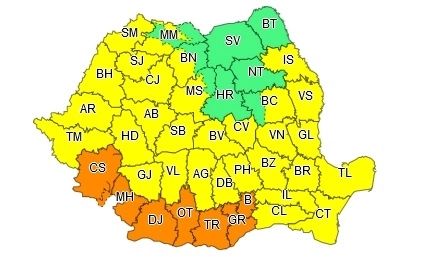 În județele Maramureș, Bistrița-Năsăud, Mureș, Harghita, Suceava, Neamț, Bacău, Botoșani, Iași și Vaslui vor fi perioade cu instabilitate atmosferică deosebit de accentuată. Vor fi vijelii puternice, intensificări ale vântului cu rafale de peste 70...80 km/h, frecvente descărcări electrice și grindină. Pe alocuri aversele vor fi torențiale, iar cantitățile de apă vor depăși izolat 25...30 l/mp.