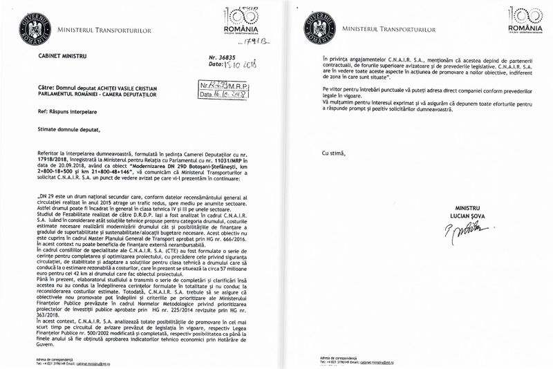 Deputatul PNL Cristian Achiței a adresat o interpelare ministrului Transportului, cerând explicații cu privire la DN 29D Botoșani - Ștefănești. Lucian Șova, ministrul Transporturilor, a precizat că acest drum nu a fost inclus în Master Planul de transport.