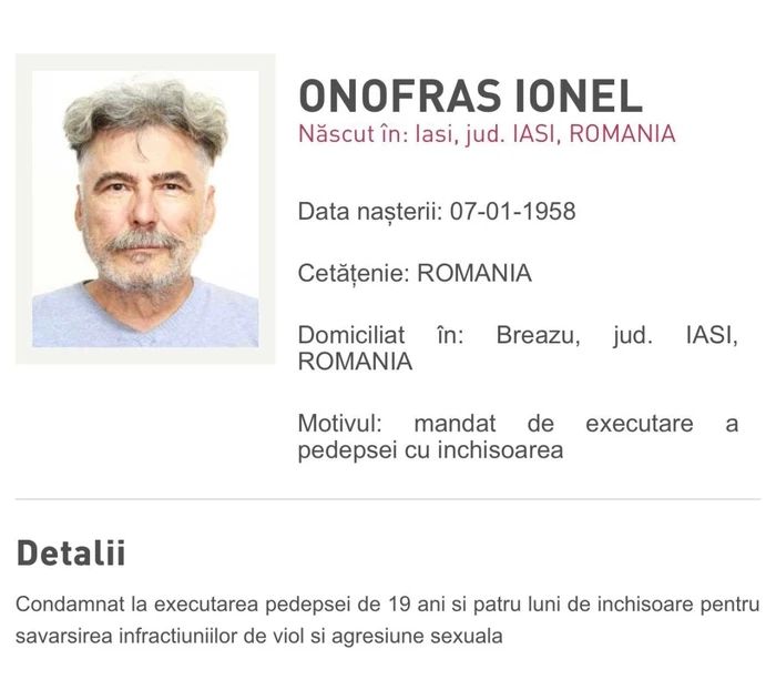 Fostul primar al Iașiului, Ionel Onofraș, a fost condamnat definitiv la aproape 20 de ani de închisoare pentru viol și agresiune sexuală asupra unor minore. După pronunțarea sentinței, acesta nu a fost găsit la domiciliu și a fost dat în urmărire la nivel național.