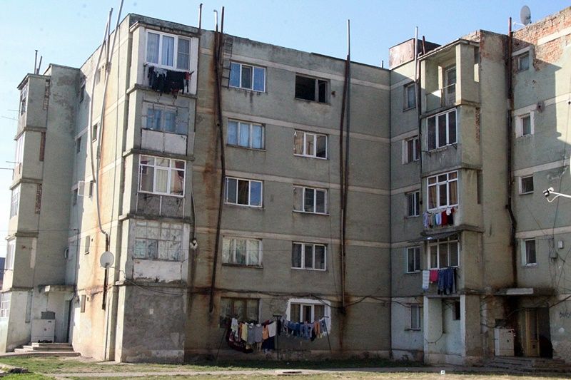 În centrul orașului sunt câteva blocuri care seamănă cu niște ghetouri. Oamenii au sobe iar rețeaua de apă și canalizare este într-un stadiu avansat de degradare. La vreo 50 de metri de primărie sunt vreo 10-15 bărbați care stau. Stau și mănâncă semințe. Doi bărbați stau pe iarbă și joacă un joc cu cărți. Se plâng că primăria nu face și că nu au condiții.