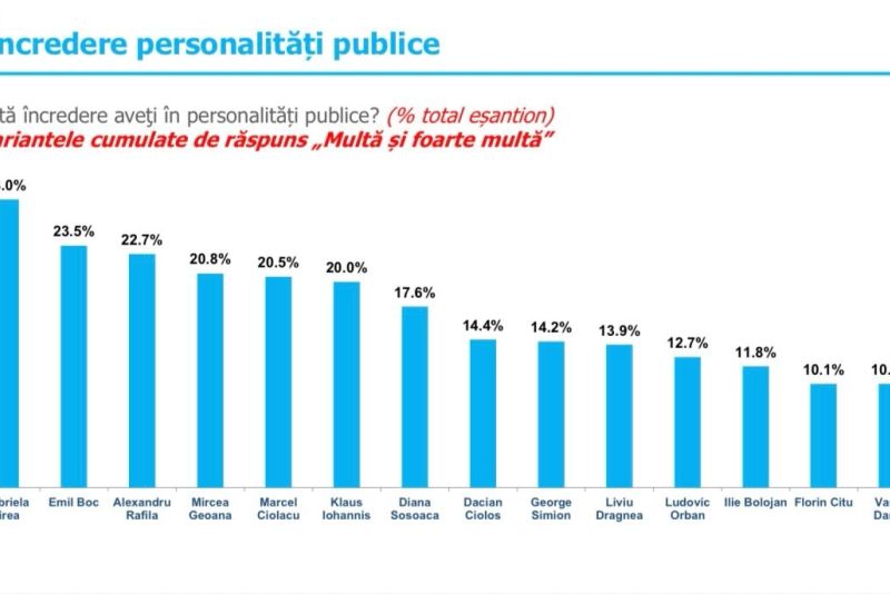 La întrebarea: Câtă încredere aveţi în personalități publice?”, cu variantele cumulate de răspuns „Multă și foarte multă”, respondenții au spus într-un procent considerabil: Gabriela Firea.