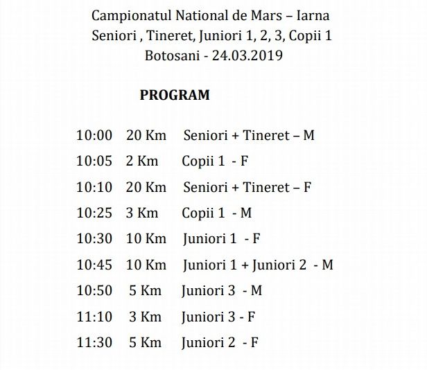 Competiția se va desfășura pe strada I.C. Brătianu iar traseul măsoară 1000 de metri. La ora 10.00 se va da primul start, când în competiție vor intra sportivii de la categoriile tineret și seniori. Campionatul Național de Marș este organizat de Federația Română de Atletism, în colaborare cu Asociația Județeană de Atletism, director de concurs fiind profesorul Constantin Nacu, directorul Clubului Sportiv Școlar Botoșani.